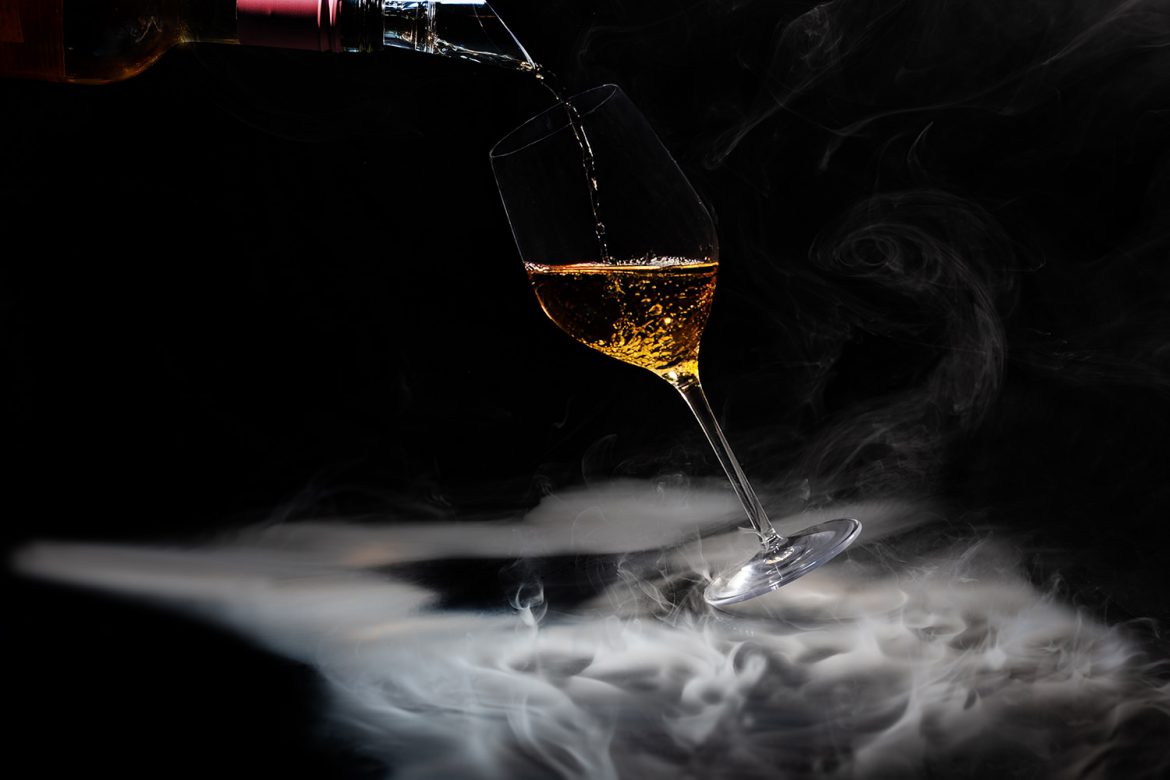 Technisch war dieses Bild anspruchsvoller, als es auf den ersten Blick erscheinen mag. Beim Eingießen musste das Glas stabil stehen bleiben, der Wein sollte kontrolliert und sauber laufen, während der Rauch zeitgleich durch das Bild spielen sollte. In solchen Momenten entscheidet nicht nur Technik, sondern vor allem Timing. Alles muss zusammenpassen: Licht, Bewegung, Stabilität und der exakte Auslösezeitpunkt.