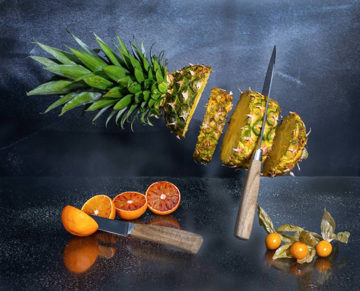 Meine Inspiration war es, scharfe Küchenmesser und Früchte in einem Bild zu vereinen. Die größte Herausforderung war es, Ananasscheiben so zu platzieren, dass sie mit den Messern eine harmonische und gleichzeitig dynamische Komposition bildeten. Dies erforderte viel Geduld und Präzision, besonders um sicherzustellen, dass die Messer in der gewünschten Position blieben.