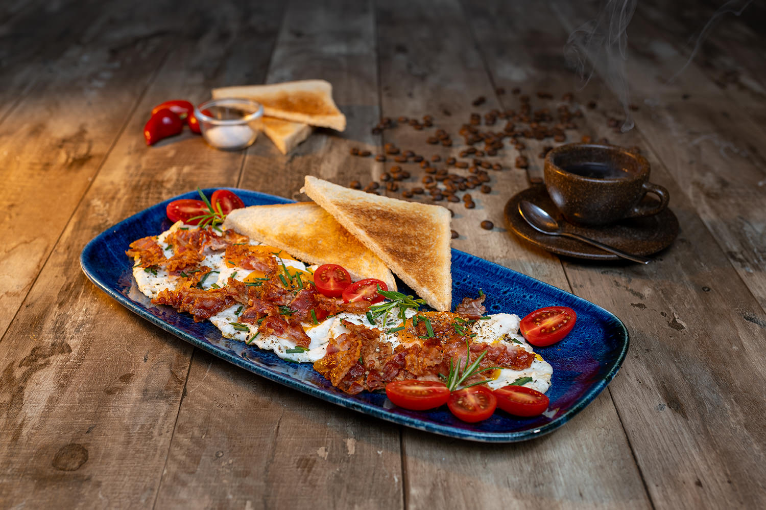 Dekoelemente: Teller, Toast, Spiegeleier, Bacon, Schnittlauch, Kaffee, Kaffeebohnen, Rosmarin, kleine Schälchen mit Salz