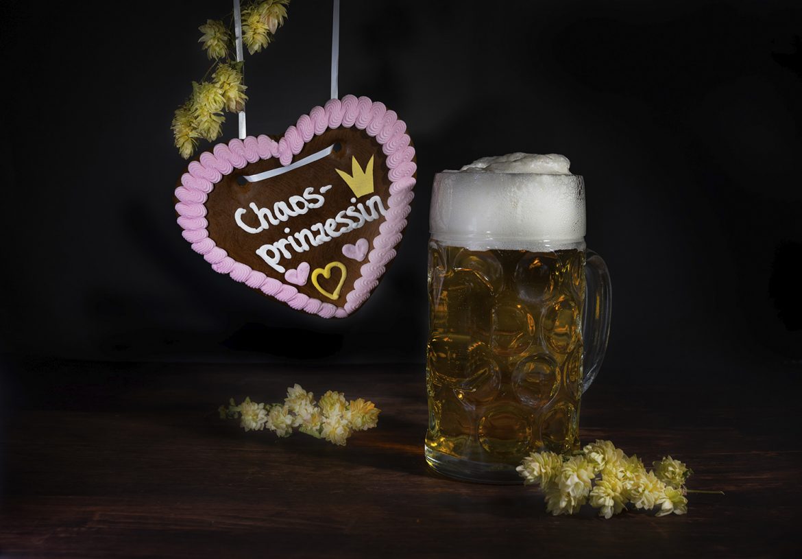 Aber was wäre die Wiesn ohne den obligatorischen Maßkrug Bier? Deshalb habe ich beides – das Lebkuchenherz und den Maßkrug – in einem Bild vereint. Als besonderes Detail fügte ich etwas frischen und getrockneten Hopfen hinzu, um die Oktoberfeststimmung komplett zu machen.