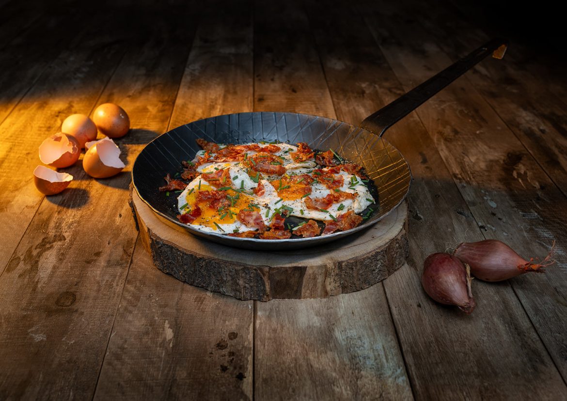Requisiten: eine gusseiserne Pfanne, Zwiebeln als Farbakzent, grober Pfeffer, frischer Schnittlauch, und das Ganze auf einer rustikalen Holzscheibe inszeniert