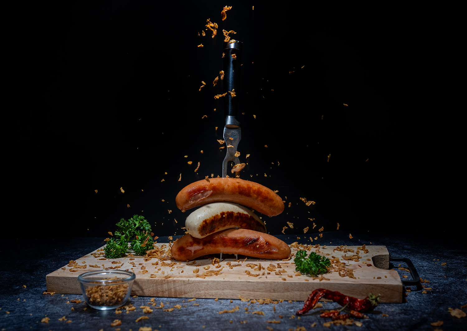 Das Licht kam klassisch von oben – ein Spot, der gezielt Highlights setzt und die Struktur der Würste betont. Schwarze Hintergründe sorgten für Tiefe und lenkten den Blick aufs Wesentliche. Die Aufnahme entstand mit meiner Nikon Z7 und dem Sigma 35 mm – ISO 100, Blende 8, Belichtungszeit 1/125. Das Setup hat wie so oft Geduld gefordert, aber ich finde, das Ergebnis kann sich sehen lassen.