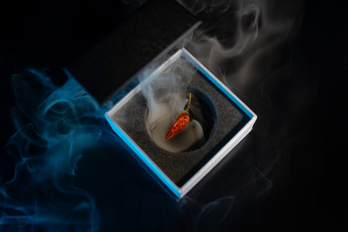 Ich glaube, dass wahre Schönheit viel tiefer liegt. Jedes Lebewesen, jedes Objekt, jedes Lebensmittel besitzt seine eigenen, unverwechselbaren Eigenschaften – seine Ecken und Kanten, die es einzigartig machen. Aus diesem Grund habe ich eine vertrocknete Peperoni in ein Etui gelegt, nicht trotz, sondern wegen ihrer Unvollkommenheit. Sie symbolisiert die Schönheit, die in allem existiert, auch wenn sie nicht auf den ersten Blick ersichtlich ist. Der Nebel, der manchmal alles umhüllt, dient nur dazu, diese unkonventionelle Schönheit zu verbergen.