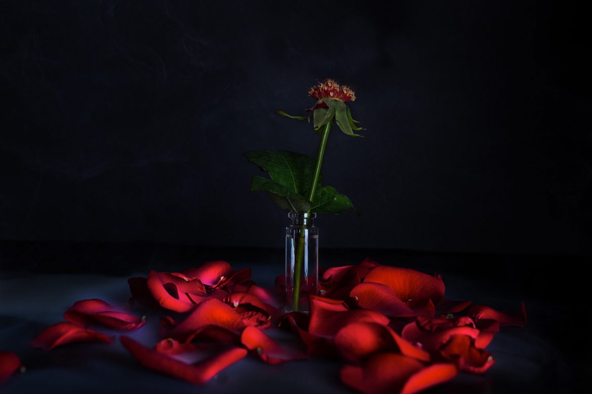 In der heutigen Betrachtung steht eine Rose im Mittelpunkt meines Bildes – eine Rose, die ihre Blütenblätter verloren hat. Ein stummes Zeugnis dafür, dass alles Endlichkeit besitzt, wenn wir nicht sorgfältig darauf achten. Die rote Rose, Symbol der Liebe schlechthin, zeigt uns, wie auch die schönste Blüte irgendwann verwelkt.